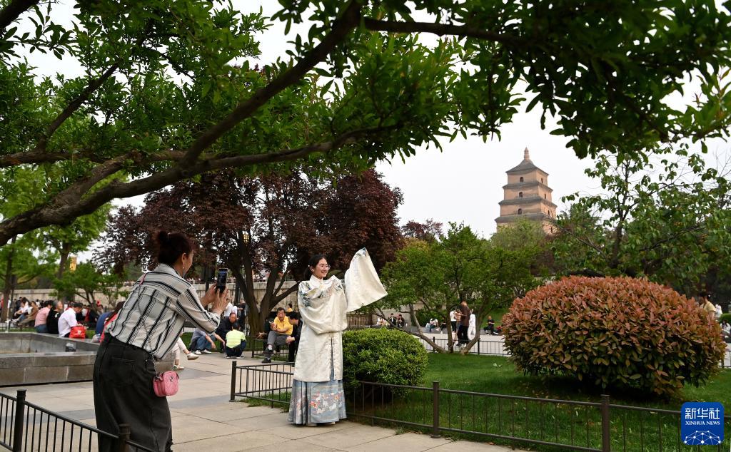 游客在西安大雁塔北广场游览留影(4月18日摄)。