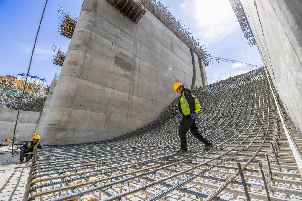 2022年5月21日,在内蒙古兴安盟,工人在引绰济辽工程文得根水利枢纽施工现场忙碌。新华社记者刘磊 摄