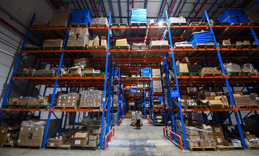 2022年9月2日,在杭州综合保税区一家跨境保税仓内,工作人员在搬运跨境电商保税进口商品。新华社记者 徐昱 摄