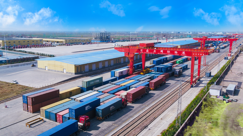 春末夏初,在位于河北省石家庄市高邑县的石家庄国际陆港,运输作业正在有条不紊地进行。满载着日用品、箱包、工业配件等商品的集装箱有序码放在作业场上,等待着被装车运送至不同国家和地区。