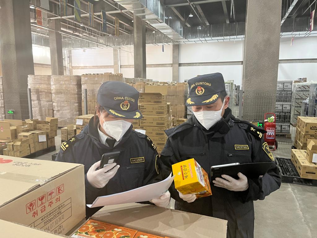 图为曹妃甸海关关员查验跨境电商商品。(于佺 摄)