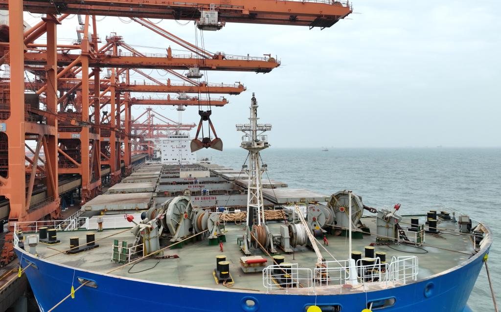 4月17日,一艘轮船靠泊在唐山港曹妃甸港区矿石码头(无人机照片)。新华社记者杨世尧 摄