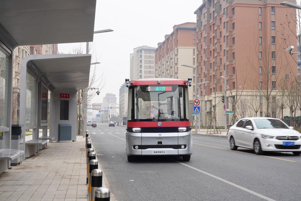 智能网联巴士901线测试车在河北雄安新区容东片区道路上行驶(2023年3月20日摄)。新华社记者 牟宇 摄