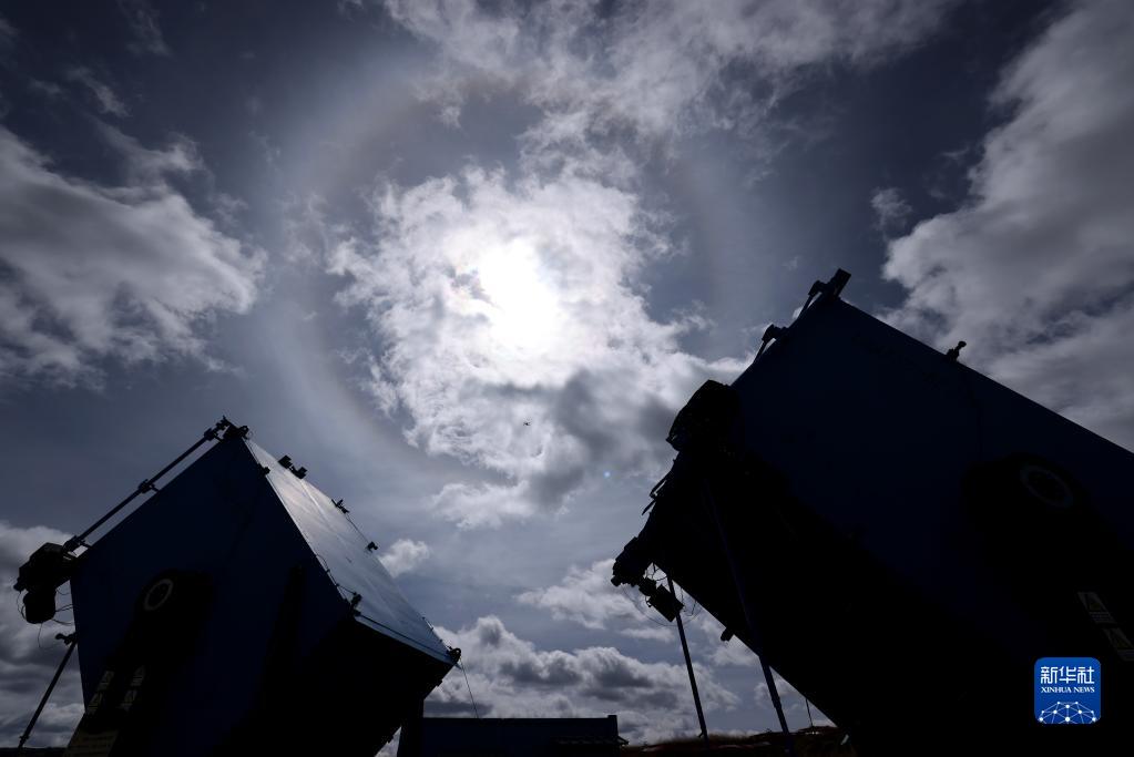 4月22日,高海拔宇宙线观测站观测基地广角切伦科夫望远镜上空出现日晕。新华社记者 金立旺 摄