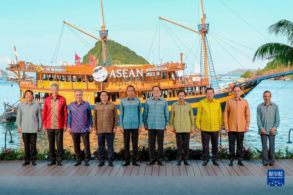 5月11日,在印度尼西亚拉布安巴焦,第42届东盟峰会与会领导人在会场外合影。新华社发(东盟峰会组委会供图)