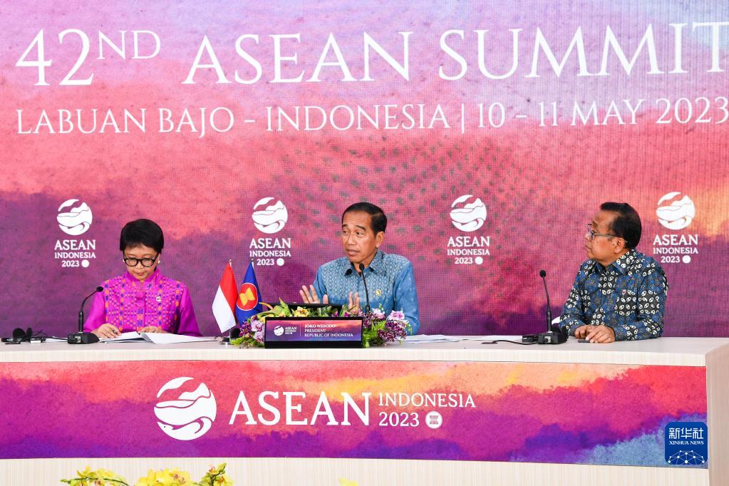 5月11日,在印度尼西亚拉布安巴焦,印尼总统佐科(中)在第42届东盟峰会闭幕后召开新闻发布会。新华社记者 徐钦 摄