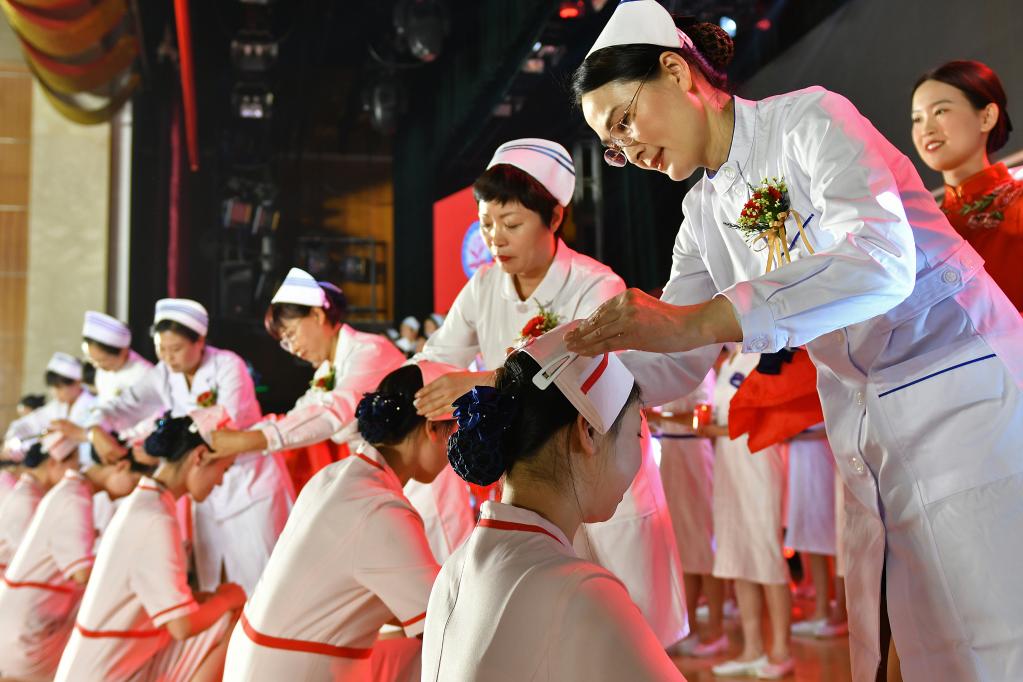 5月10日,山东省烟台护士学校举行护士节授帽仪式,护理前辈为即将踏入实习岗位的学生授帽。新华社发(孙文潭摄)
