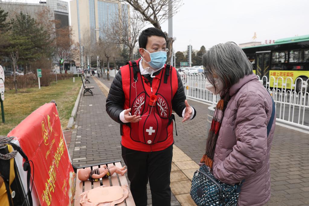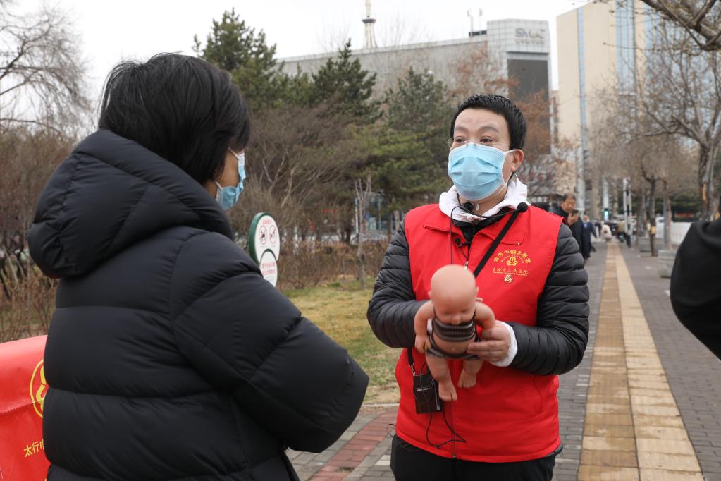 范潞霞在为市民义务讲解急救知识。新华社记者 徐伟 摄