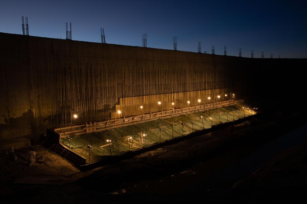 ↑工人们用大功率照明给刚浇注水泥的观测基地WCDA水池围墙防寒(2017年11月17日摄)。
