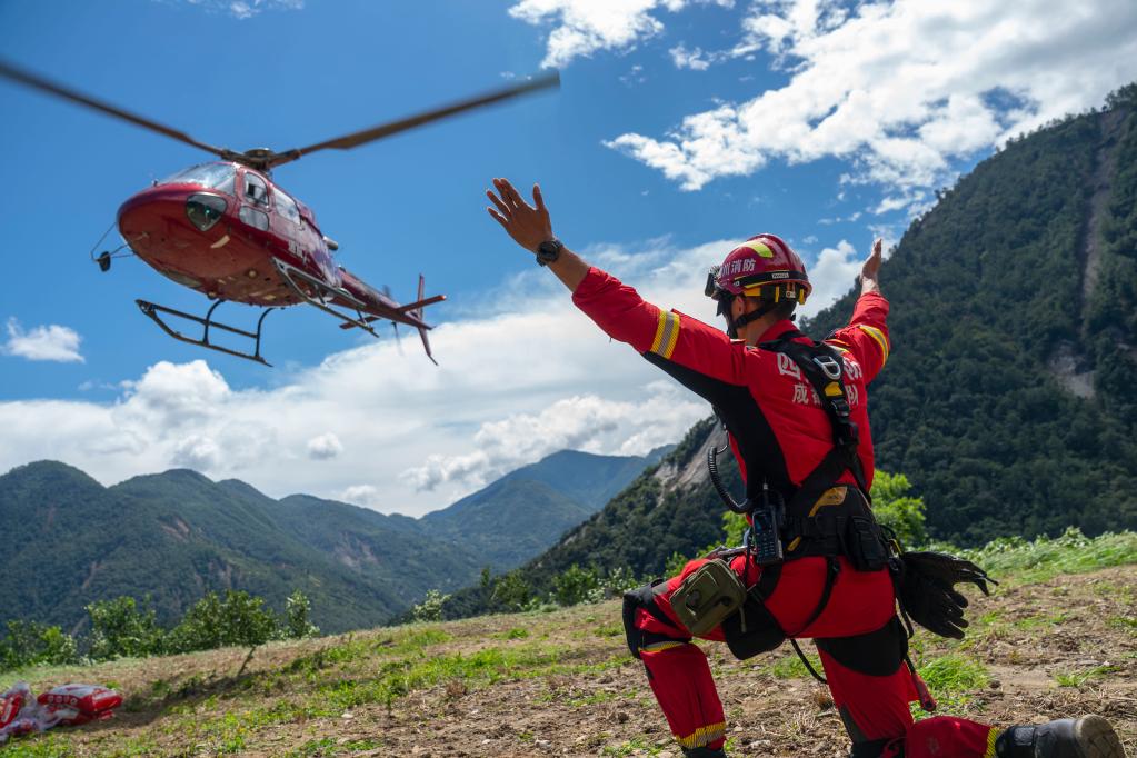 2022年9月10日,在四川省石棉县王岗坪彝族藏族乡幸福村,救援人员引导应急管理部南方航空护林总站的救援直升机。新华社记者 才扬 摄