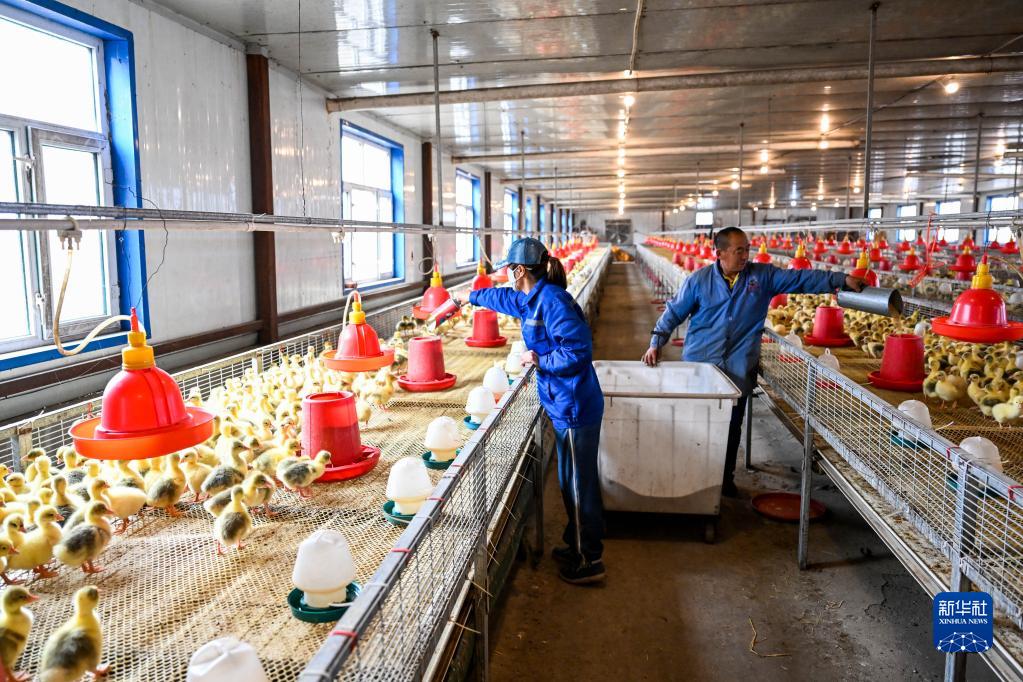 5月12日,阿荣旗全顺大鹅养殖专业合作社工人给鹅雏喂食。