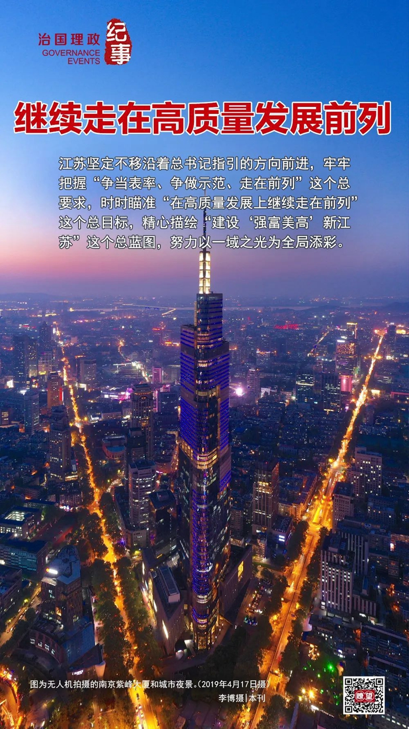 通计熟筹,蹇视高步。江苏坚定不移沿着总书记指引的方向前进,牢牢把握“争当表率、争做示范、走在前列”这个总要求,时时瞄准“在高质量发展上继续走在前列”这个总目标,精心描绘“建设‘强富美高’新江苏”这个总蓝图,努力以一域之光为全局添彩。