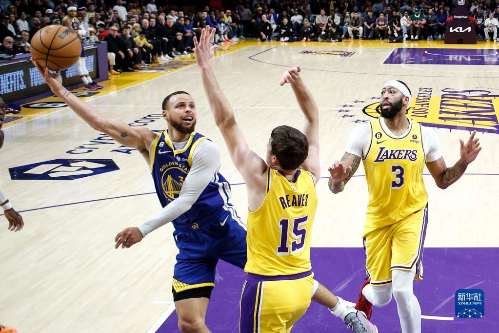 5月12日,勇士队球员斯蒂芬·库里(左)在湖人队球员奥斯汀·里维斯(中)防守下投篮。新华社发(赵汉荣摄)