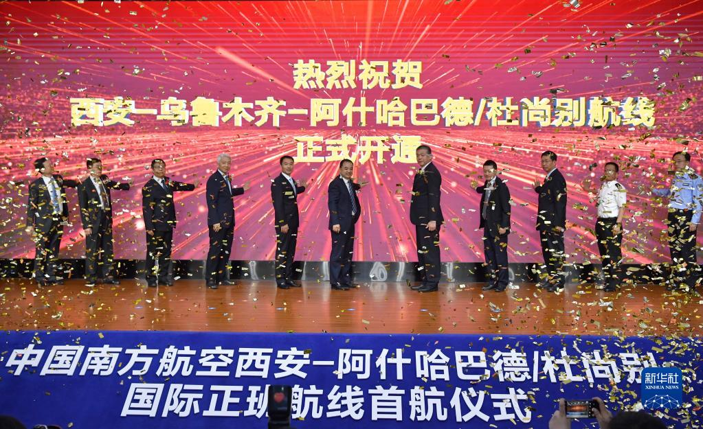 5月13日,西安-阿什哈巴德/杜尚别国际正班航线首航仪式在西安举行。新华社记者 邵瑞 摄