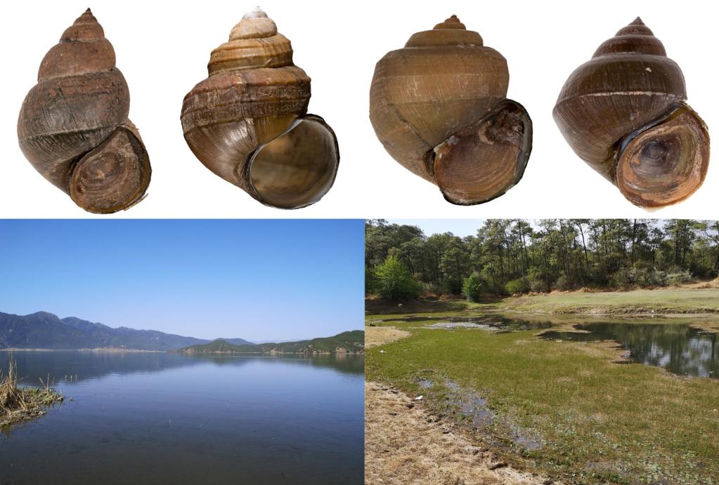上图为理田螺属4个物种(从左至右:德拉维理田螺、尖龙骨理田螺、滇西理田螺、塔形理田螺),下图为采集地环境——泸沽湖(左)和丽江某湿地(右)。(张乐嘉 摄)