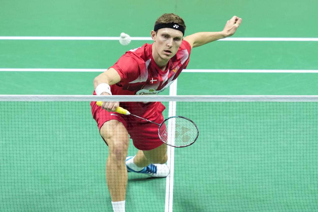 5月14日,丹麦选手安赛龙在男子单打比赛中回球。他以2:1战胜新加坡选手骆建佑。新华社记者杨磊摄