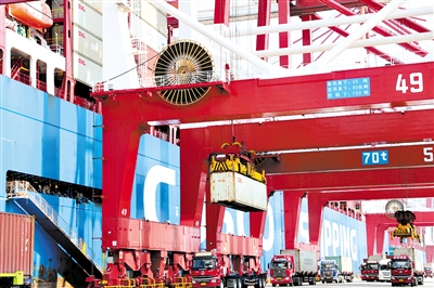 在山东港口青岛港前湾联合集装箱码头,一艘货轮在装载货物。 新华社发(张进刚 摄)