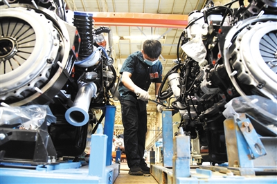 中国重汽集团济南卡车股份有限公司工作人员在生产线上作业。记者 王凯 摄