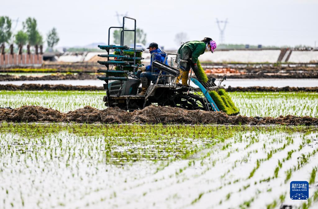 5月15日,农民驾驶插秧机在兴安盟乌兰浩特市的水稻田中插秧。