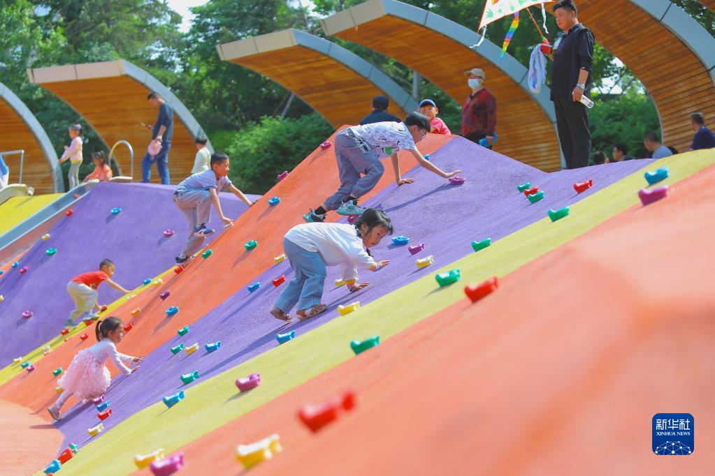 5月14日,小朋友在青岛市即墨区通济街道一个公园玩耍。