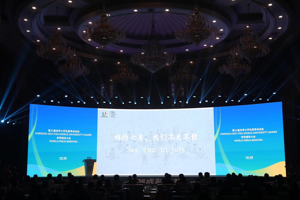 5月15日,第31届世界大学生夏季运动会世界媒体大会在成都举行。成都大运会执委会向全球媒体介绍了赛事筹办进展以及媒体运行工作的相关信息。新华社记者 贾浩成 摄
