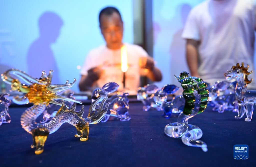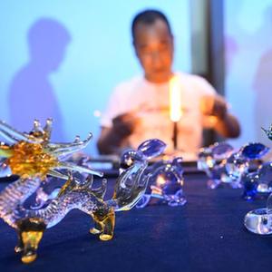 5月16日,民间艺人谭志国展示手工制作玻璃工艺品技艺。