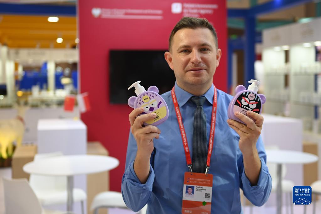 5月16日,在中东欧展馆,企业代表在展示来自波兰的日用消费品。