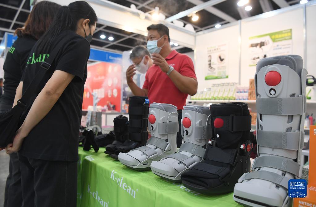 5月16日,参展商在第十四届“香港国际医疗及保健展”上介绍功能足踝护具。新华社记者 陈铎 摄