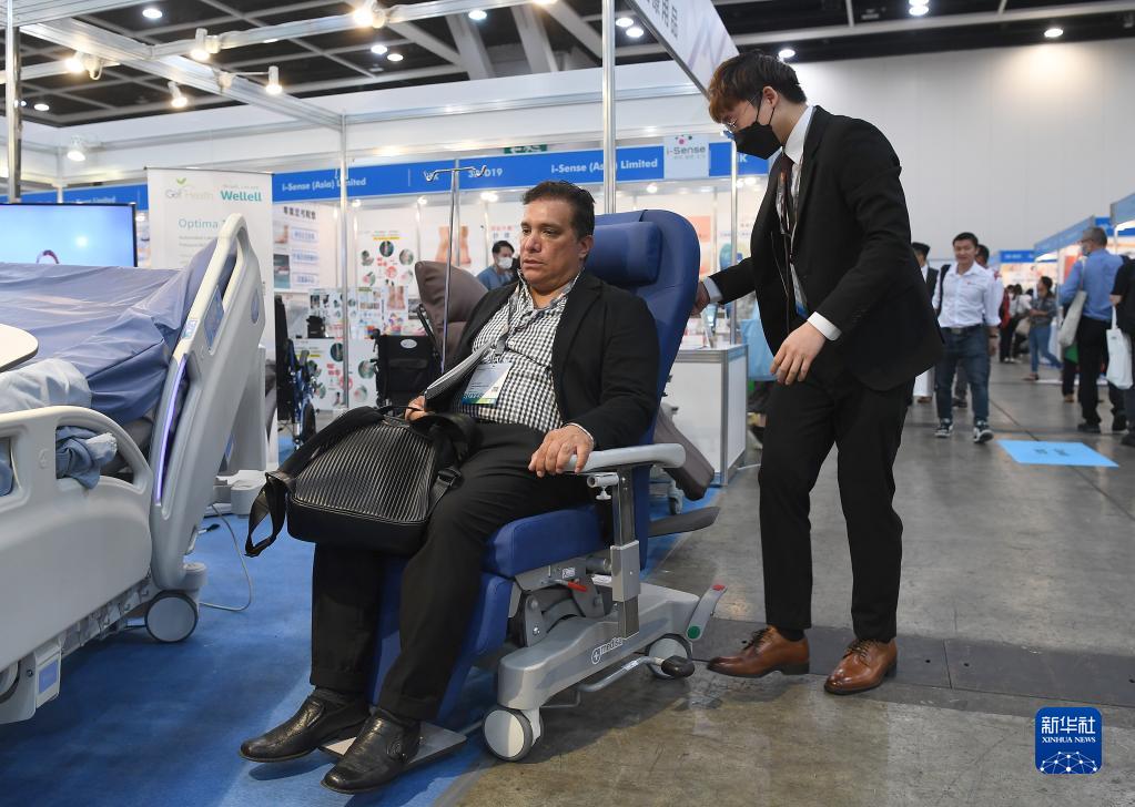 5月16日,一名买家在第十四届“香港国际医疗及保健展”上体验一款“可倾斜升降高背椅”。新华社记者 陈铎 摄