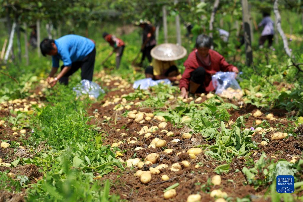 5月16日,贵州省黔南布依族苗族自治州福泉市陆坪镇罗坳村村民在分拣土豆。近日,福泉市陆坪镇罗坳村猕猴桃基地里套种的土豆迎来收获季。