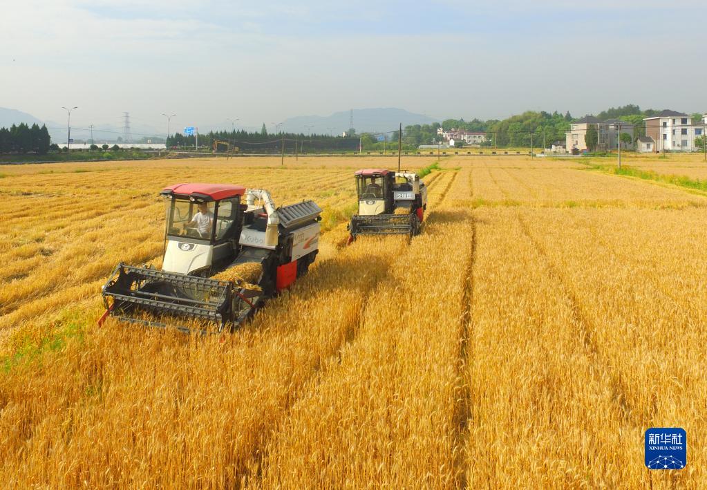 5月16日,在浙江省建德市寿昌镇山峰村田间,农民驾驶农机收割小麦(无人机照片)。