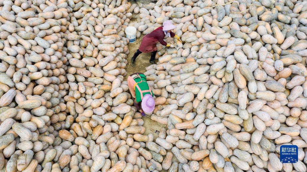 5月16日,广西南宁市西乡塘区金陵镇龙达村农民整理堆放的南瓜(无人机照片)。目前,南宁市西乡塘区金陵镇南瓜进入上市旺季,吸引区内外客商前来收购。