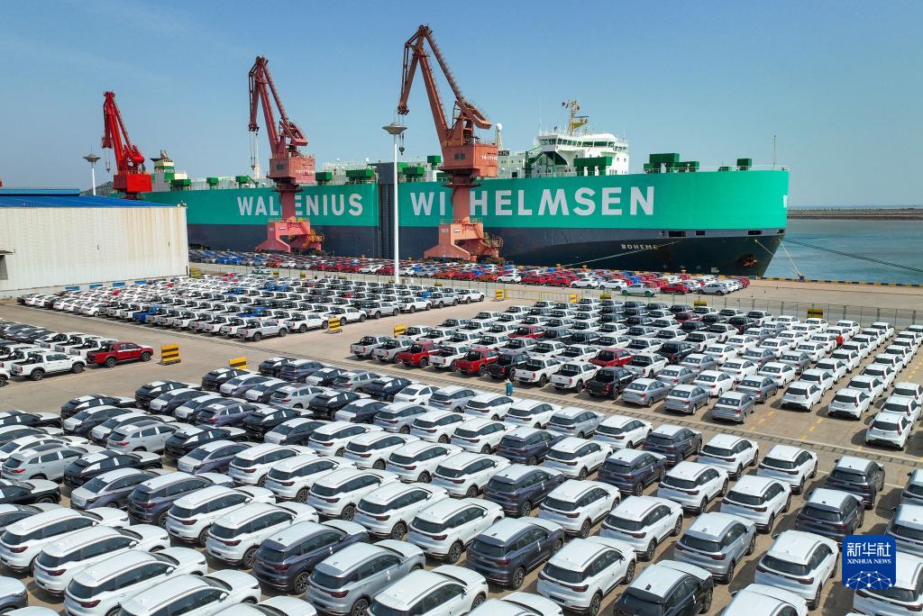 5月16日,一艘滚装船在江苏连云港港东方港务分公司码头装运出口汽车(无人机照片)。