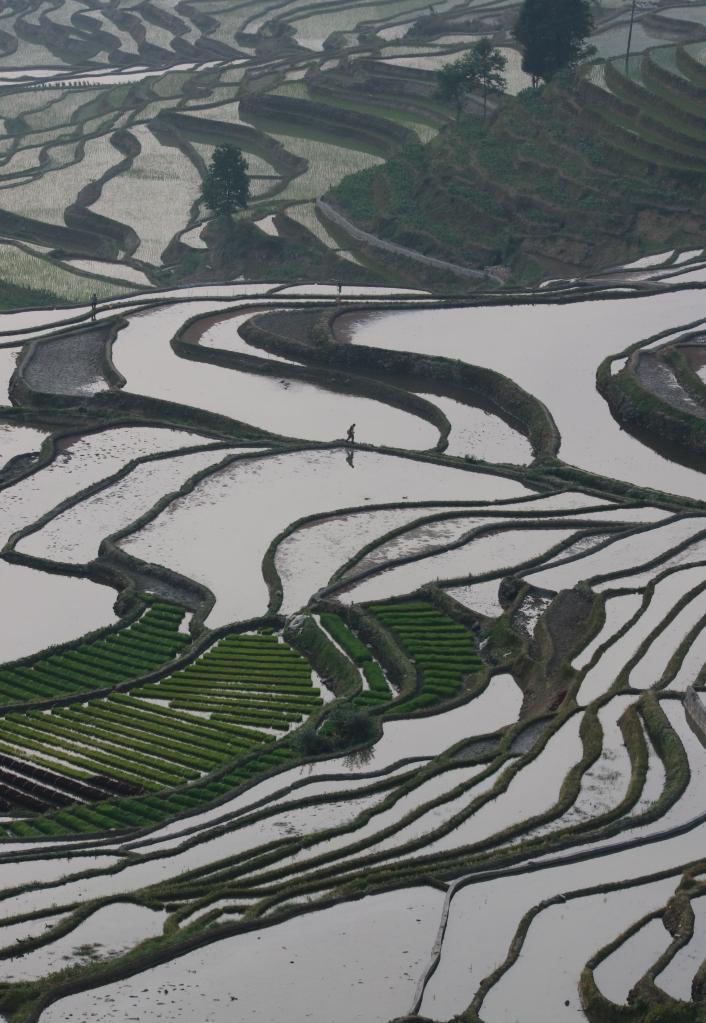 站在元阳哈尼梯田核心区的坝达梯田上方远眺,层层梯田尽收眼底:土筑的田埂随山势回旋,因坡度变化,缓坡处一块梯田可达数亩,陡坡狭窄处则只有几个簸箕大,天光水影中禾苗泛出绿色。梯田旁是村庄,村庄上面是茂密的森林。