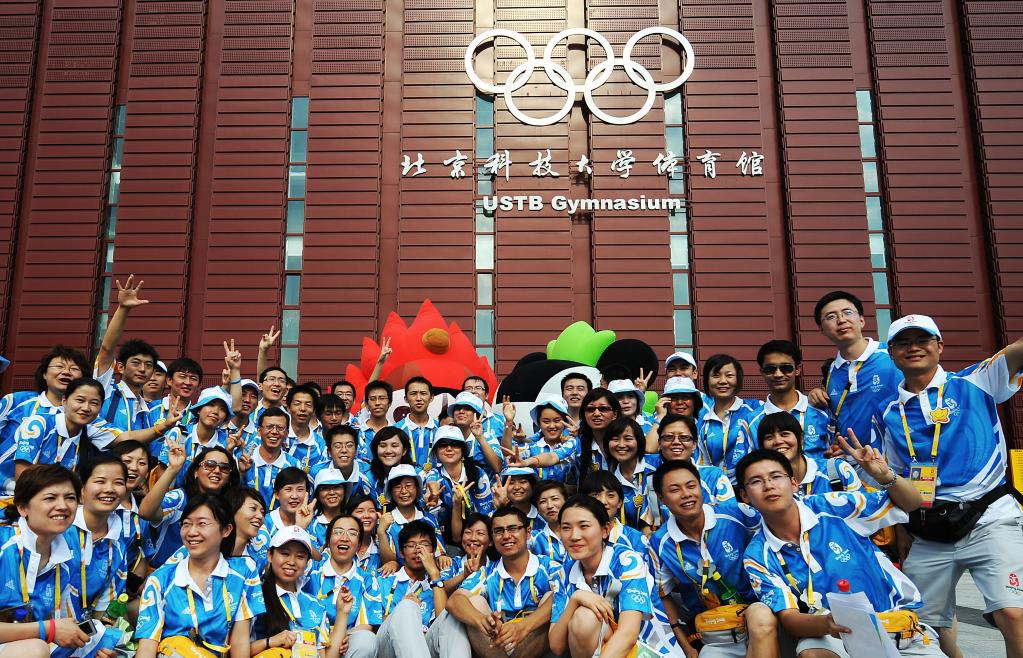 图为北京奥运会志愿者在北京科技大学体育馆合影。新华社发