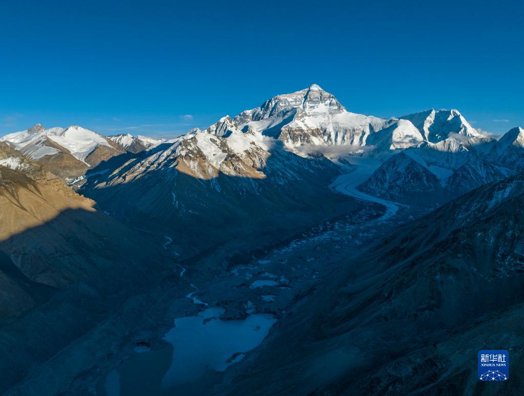 这是日落时分的珠峰和绒布冰川(5月16日摄,无人机照片)。
