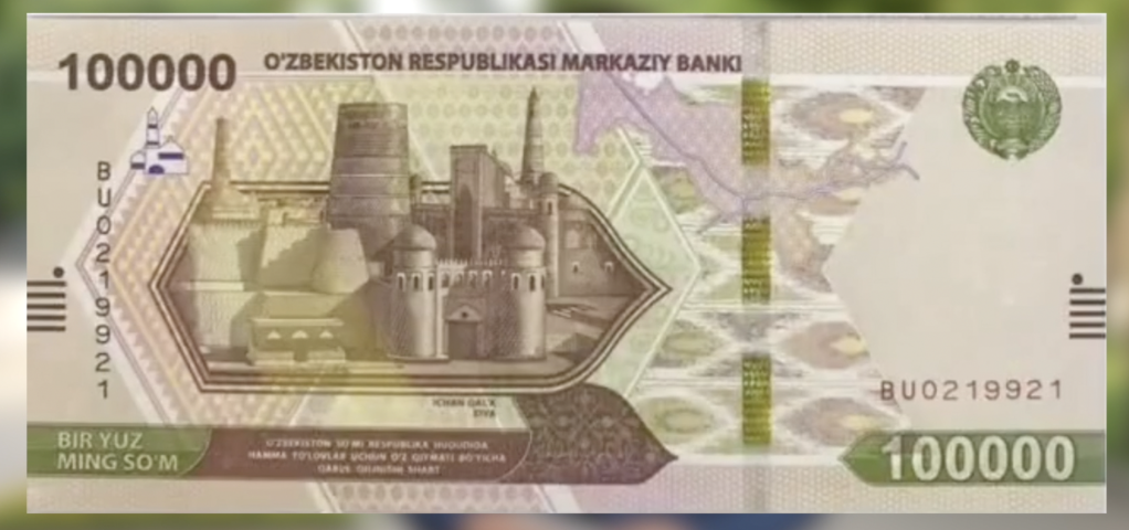 乌兹别克斯坦100000苏姆纸币。(视频截图)