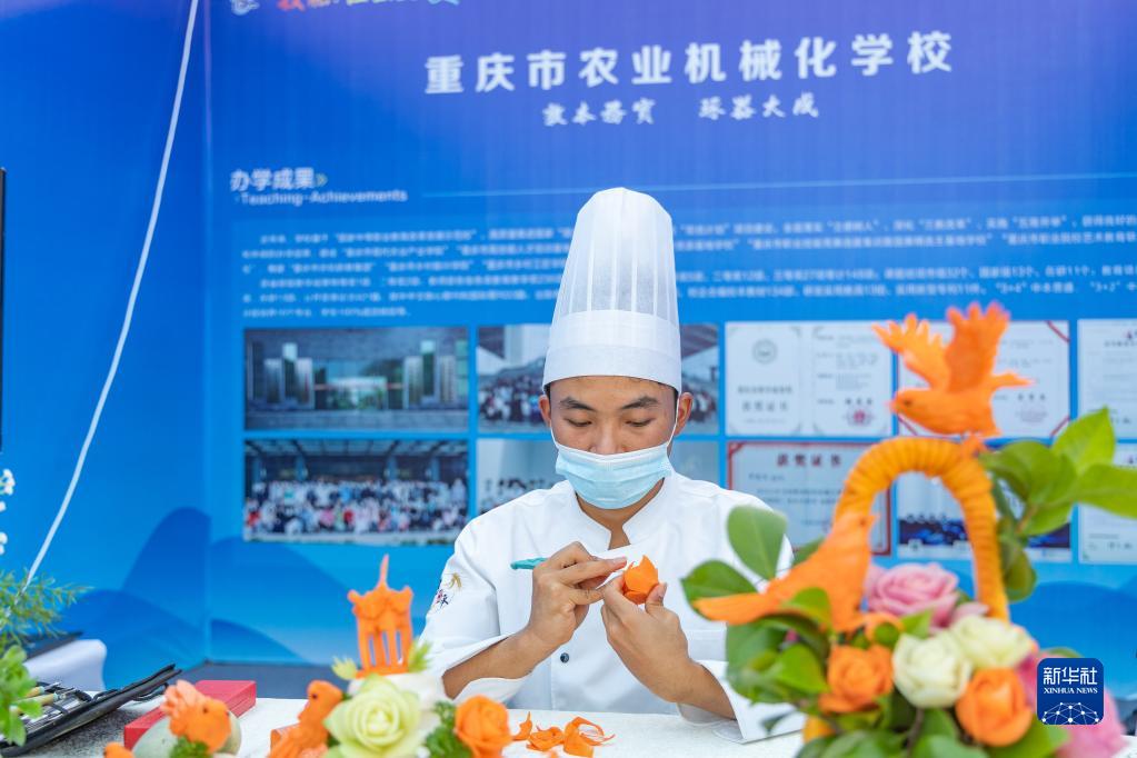 5月17日,在重庆市永川区举行的2023年成渝地区双城经济圈职业教育活动周办学成果展上,重庆市农业机械化学校学生崔志军在现场展示食品雕花技艺。