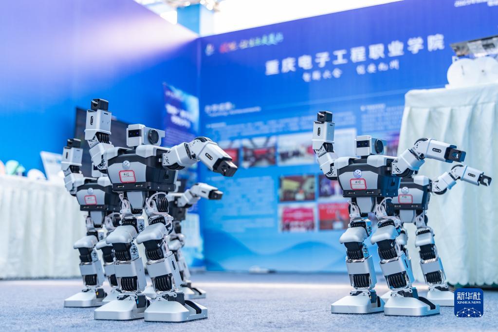 5月17日,在重庆市永川区举行的2023年成渝地区双城经济圈职业教育活动周办学成果展上, 重庆电子工程职业学院研发的舞蹈机器人在现场演示。