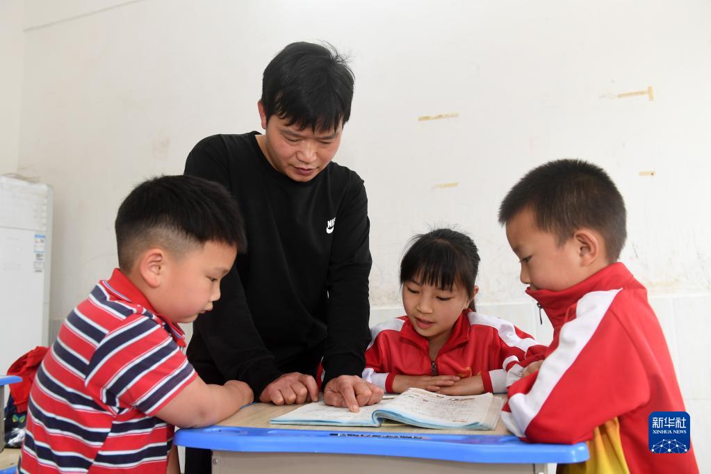 5月17日,在广西灵川县海洋乡中心岐教学点,蔡教宏在辅导学生功课。