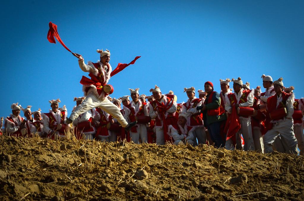2013年2月22日,安塞腰鼓手在进行山地腰鼓表演。新华社记者刘潇 摄