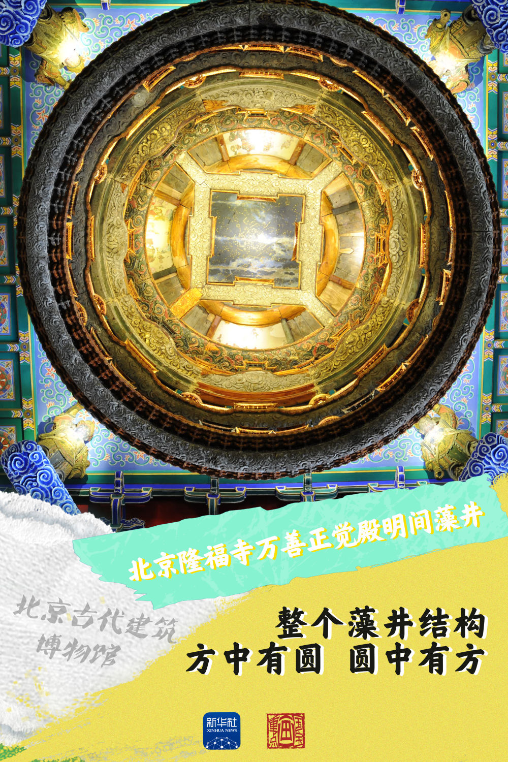 北京古代建筑博物馆的镇馆之宝是这座美轮美奂的藻井,整个藻井的结构为方井内含圆井,圆井内又含方井。藻井四角立力士雕像,意在托起中心圆井。圆井应为六层框架,现存有五层,其中几层之上布置有天上宫阙。宫阙里有精雕细琢的仙人天女,表情神态极为细腻。藻井的最上方是一幅星象图,在灯光照射下宛若星河。
