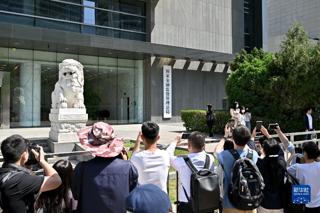 5月18日,媒体记者在国家金融监督管理总局门前拍摄。 新华社记者 李鑫 摄