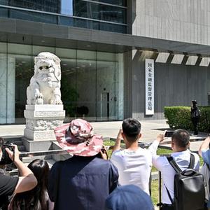 5月18日,媒体记者在国家金融监督管理总局门前拍摄。