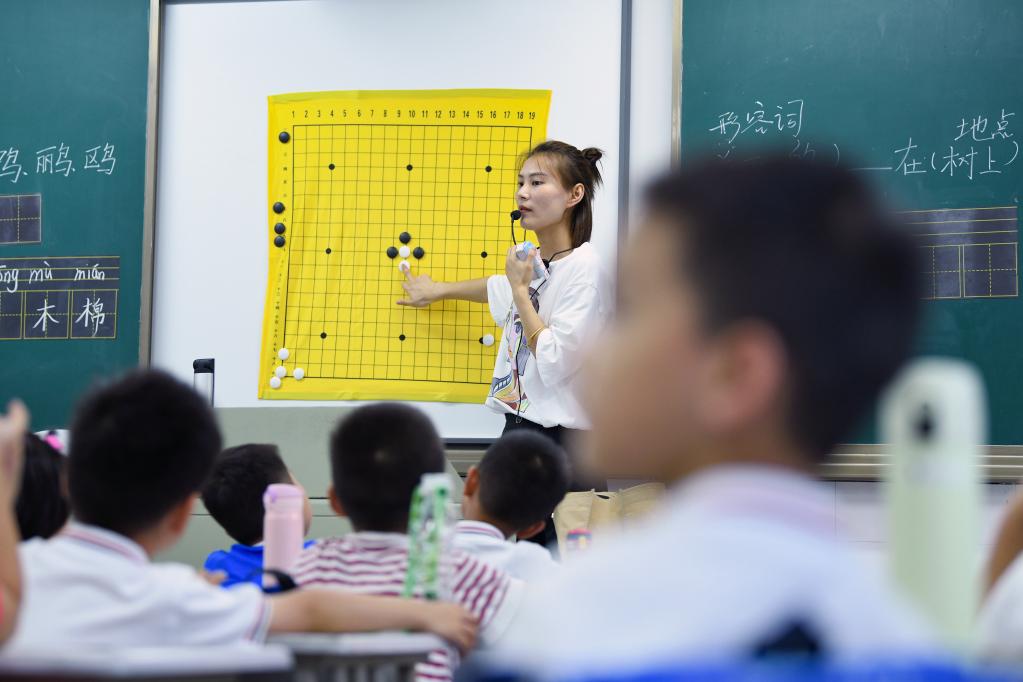 2021年9月22日,合肥市稻香村小学岳西路校区老师在课后教孩子们学习围棋。新华社发(刘玉才摄)