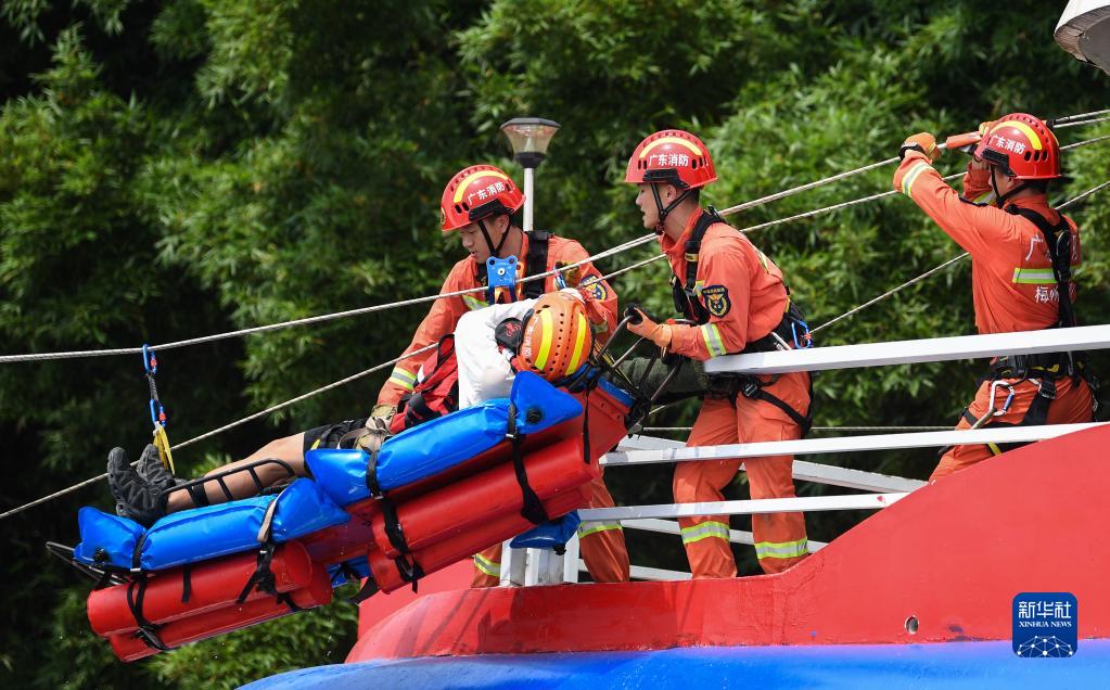 5月18日,参加演练的消防人员通过绳索和漂浮担架营救“被困群众”。