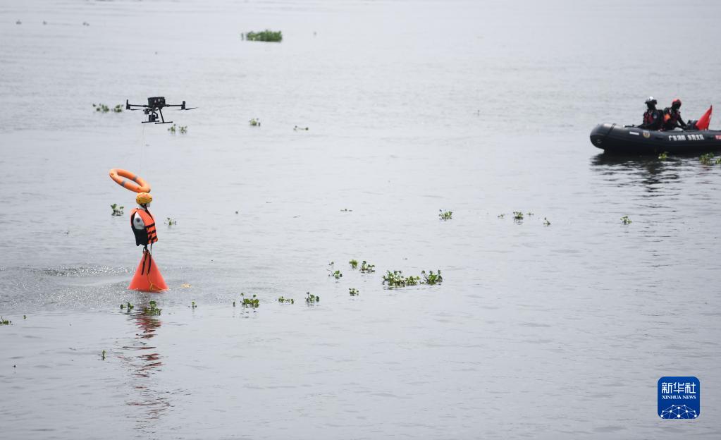 5月18日,消防员在演练中通过无人机投放救生圈。