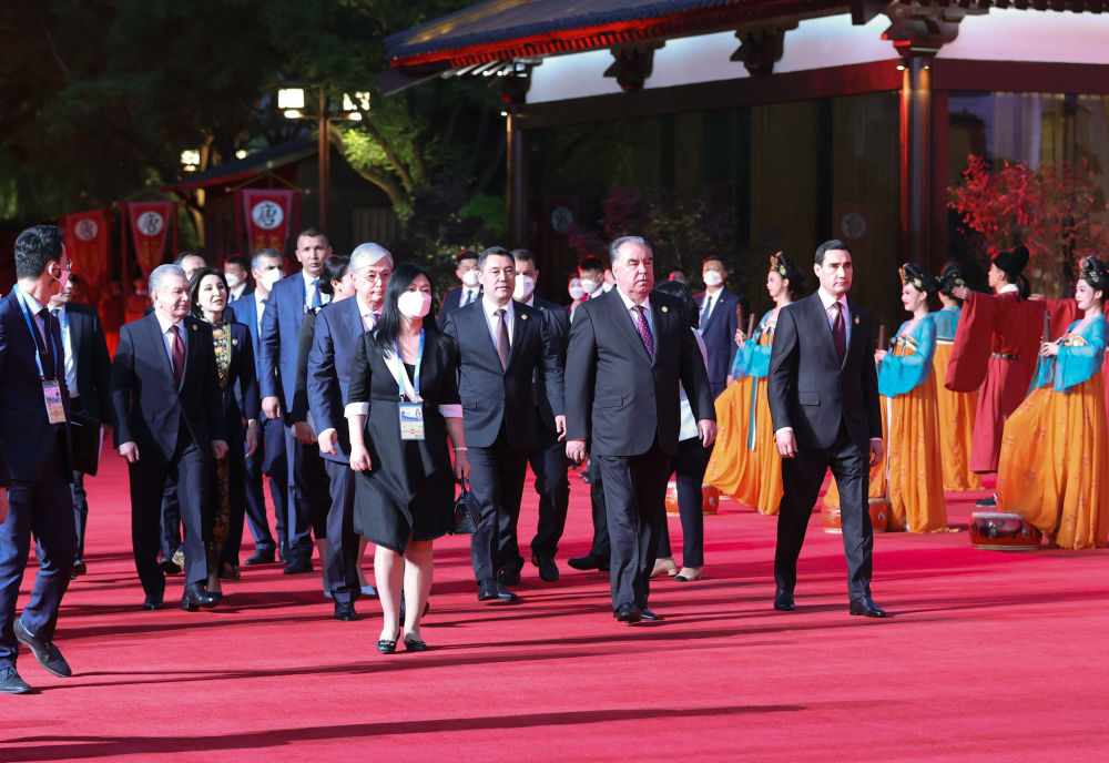 哈萨克斯坦总统托卡耶夫、吉尔吉斯斯坦总统扎帕罗夫和夫人扎帕罗娃、塔吉克斯坦总统拉赫蒙、土库曼斯坦总统别尔德穆哈梅多夫、乌兹别克斯坦总统米尔济约耶夫和夫人米尔济约耶娃抵达紫云楼前。