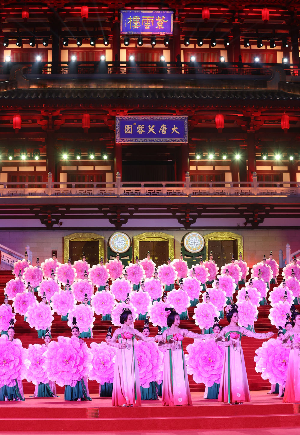 习近平夫妇为贵宾举行唐朝传统迎宾仪式。紫云楼前,礼乐和鸣,明快有力的古代佾舞、绚丽婀娜的芙蓉花舞,表达了古都西安人民的热情好客,体现了中华文化兼容并蓄的精神风貌。