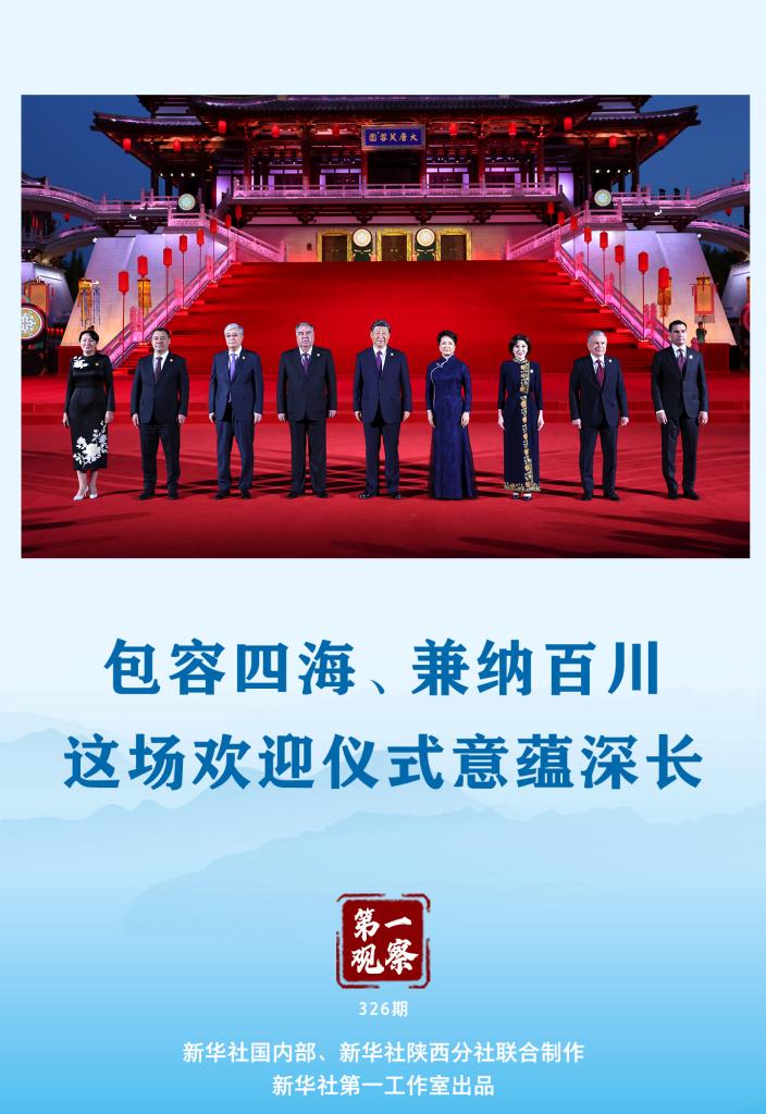 紫云楼前,这场以“大唐盛礼”为主题的迎宾仪式上,64名舞者以中国古代最高礼仪舞蹈八佾舞,向中亚宾朋致以深切敬意;100名表演者以飞旋舞动的芙蓉花,向远方宾客寄予深情祝福。